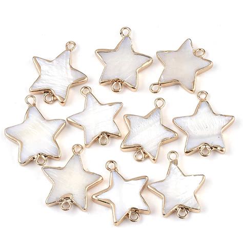 FASHEWELRY 10Pcs Natural Celestial Star Freshwater Shell Pendant Connectors Double Loops Five-Pointed Star Charm Links With Gold Edge Wrapped 22-23X18