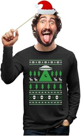 Alien Reindeer Abduction Long Sleeve Shirt Men UFO Ugly Christmas Tshirts Large Black