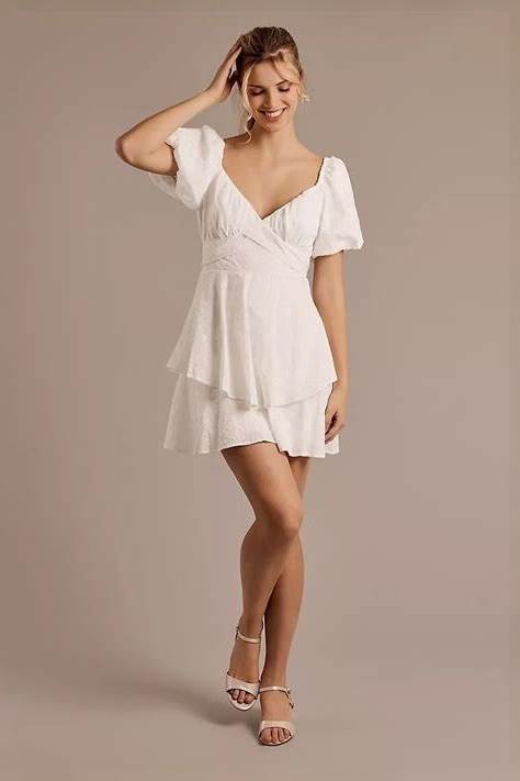 Crystal Doll Deep V-Neck Eyelet Lace Tiered Short Dress In White | Size: Medium | David's Bridal